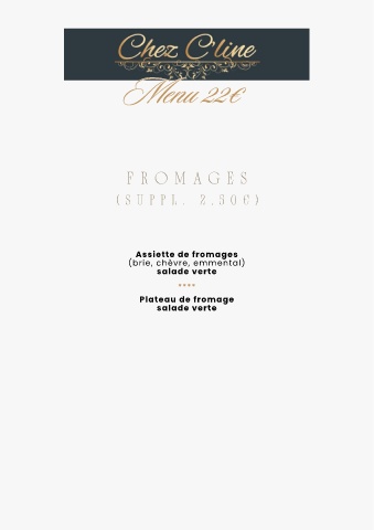M e n u 2 2 € Menu 22€ F R O M A G E S ( S U P P L . 2 , 5 0 € ) Assiette de fromages (brie, chèvre, emmental) salade verte **** Plateau de fromage salade verte