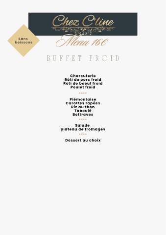 M e n u 1 6 € Menu 16€ Sans boissons B U F F E T F R O I D Charcuterie Rôti de porc froid Rôti de boeuf froid Poulet froid **** Piémontaise Carottes rapées Riz au thon Taboulé Bettraves **** Salade plateau de fromages **** Dessert au choix